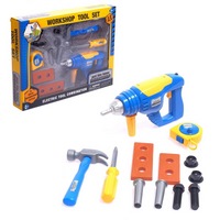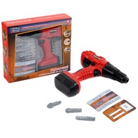В наборе: дрель со съемными насадками, дощечки, угольник, молоток, струбцина , отвертка со съемной насадкой болты, гайки.